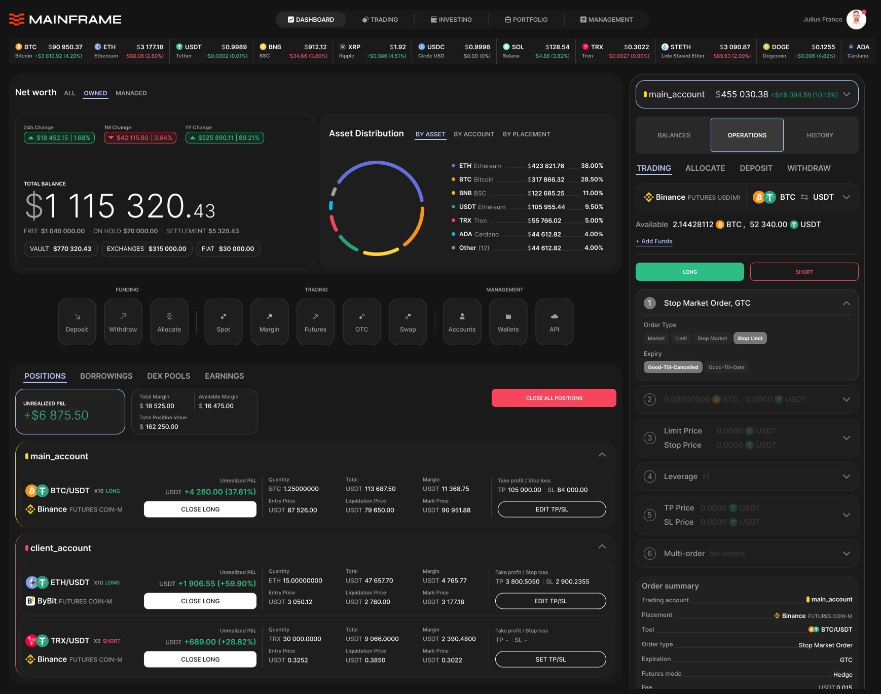 Mainframe combines what institutions actually need into a single operating frame: one onboarding, regulated access, insured custody, cross-venue execution, and unified controls — so you can trade, allocate, and report without switching tools or counterparties.