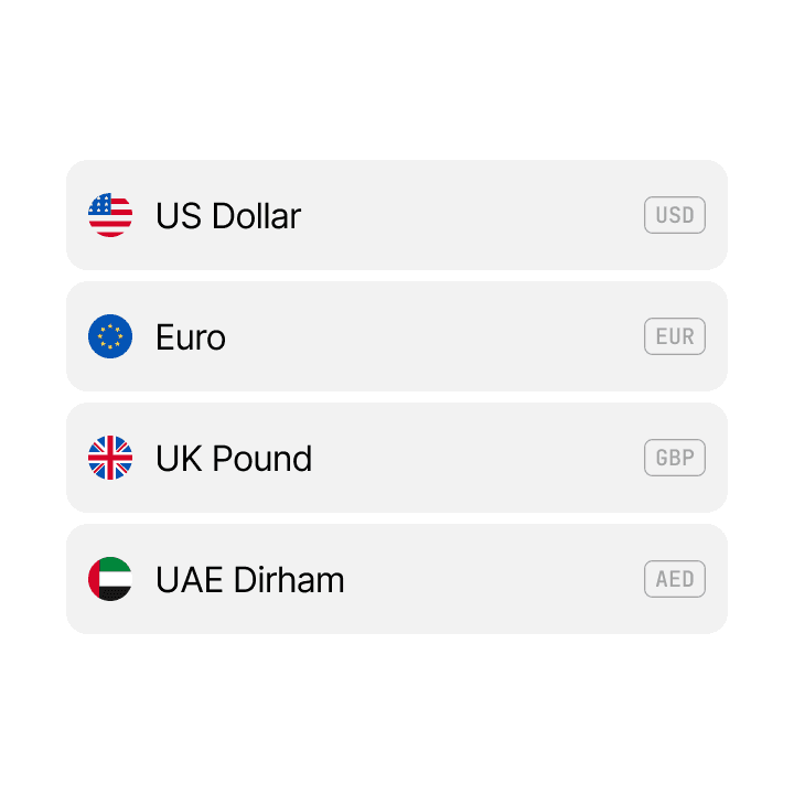 Operate with supported fiat currencies in you accounts: EUR / USD / GBP / AED, and more coming soon